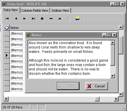 Many databases support long string data types often called Memos. DBQwikEdit will allow you to view and edit memo fields directly. Simply double click the word "Memo" in the data grid and your will invoke the memo editor. Use this editor much in the same way you would use notepad.